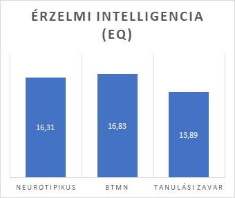 Kutatási kérdésünk azokból a korábbi vizsgálatokból indult ki, amelyek igazolták a tanulmányi eredményesség és az érzelmi intelligencia közötti együtt járást. Arra voltunk kíváncsiak, hogy a kapcsolatot – a korábbiakban nem vizsgált- különleges bánásmódot igénylő, azon belül beilleszkedési, tanulási, magatartási nehézséggel (BTMN) küzdő és integráltan tanuló sajátos nevelési igényű (SNI), specifikus tanulási zavar diagnózissal rendelkező gyermekek esetében is megtaláljuk-e, továbbá szerettük volna feltárni azt, hogy az érzelmi intelligencia mutató tekintetében van-e eltérés a neurotipikus és az atipikus tanuló csoportok között. Vizsgálatunkban (Bartyik, Ocsenás és Polonyi 2023) 343 fő vett részt, ebből 71 fő különleges bánásmódot igénylő tanuló, átlagéletkoruk: 13,01 év. Elemzéseink fiúk esetében mutattak rá a magasabb tanulmányi eredmények és jobb érzelmi intelligencia mutató együtt járására, továbbá szignifikáns különbséget találtak az érzelmi intelligencia tekintetében a neurotipikus fejlődésmenetű és a tanulási zavarral diagnosztizált gyermekek összehasonlításában, valamint a BTMN és a tanulási zavarral küzdő gyermekcsoportok között is (2. ábra). Vizsgálati mintánkon a tanulók közötti különbségek nem csak a tanulmányi sikeresség tekintetében, hanem az érzelmi intelligencia területén is megmutatkoztak.